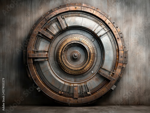 Economy balancing antique concept. A large, intricate metallic door with a circular design and a textured background.