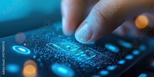 Economy charts data concept. A hand interacting with a glowing touchscreen interface in a dark environment.