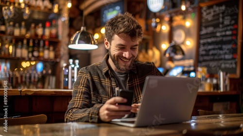 Ecstatic guy multitasking on his cellphone and laptop at a bar.