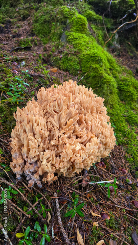 Edible beige forest coral mushroom Artomyces pyxidatus or crown coral on the background of green moss.