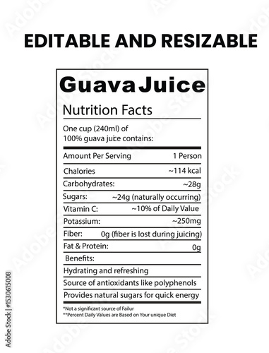 Editable & Resizable Guava Juice Nutrition Facts Label Template