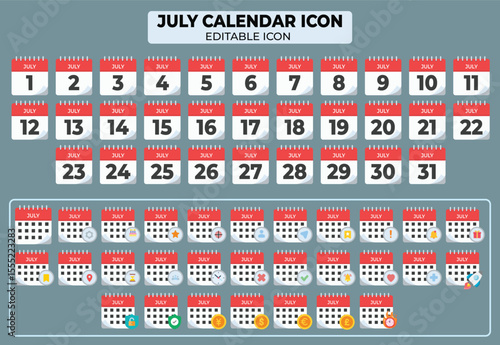 Editable July Calendar Icons Set with Dates and Various Activity Symbols, Ideal for Planning