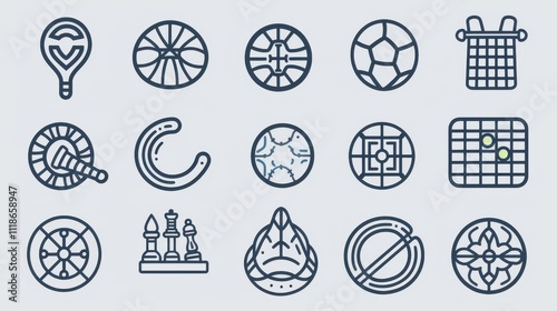 Editable line icon set of sports symbols, including football, cricket, golf, tennis, swimming, and chess, in a clean vector design