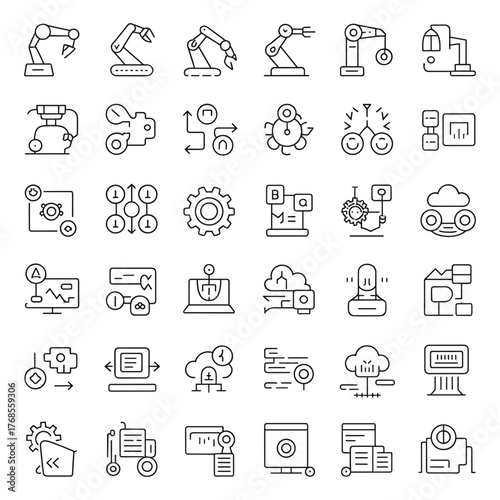 Editable Robotics & AI Technology Line Icons, Minimalist Stroke Symbols of Automation, Machine Learning, Cloud Computing, Data Systems, and Industrial Innovation