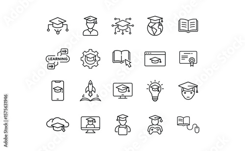 Education and Learning Icons: Graduation Caps Books and Online Learning.