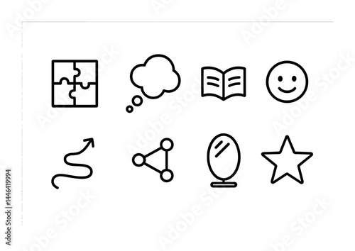 Education and learning outline icons set – study, teaching, and academic symbols for schools: puzzle, thought bubble, book, smiley, arrow, share, mirror, star.