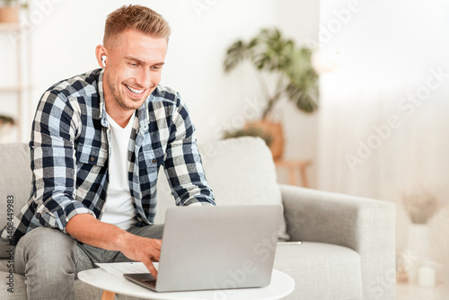 Education Concept. Cheerful guy studying online using laptop sitting on couch and wearing earbuds, copy space
