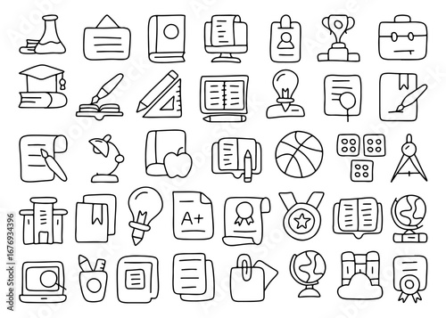 Education doodle icons set, hand drawn school line icons, learning, study, book, computer, graduation, award, creative sketch, outline vector illustration isolated on white background