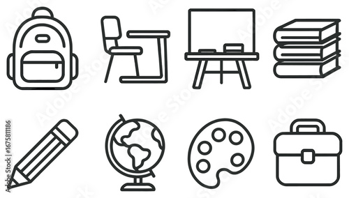 Education linear icon set. featuring backpack, desk, blackboard, books, pencil, globe, palette, briefcase