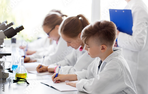 education, science and children concept - teacher and kids studying chemistry at school laboratory and writing to workbooks