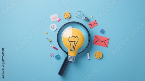 Educational growth and goal achievement concepts. Magnifying glass focuses on a light bulb representing ideas, surrounded by various education symbols. e-Learning, learning online, training course,