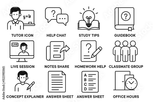 Educational support icons featuring tutor, study tips, guidebook, and homework help