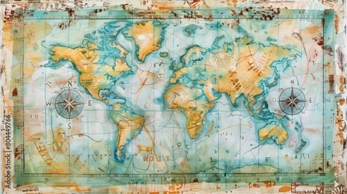 Educational watercolor of a world map with a compass rose, numbers, and letters around the border, encouraging navigation and reading skills