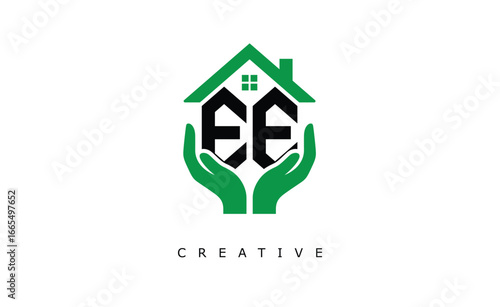 EE Home Care Logo - Green House and Hand Symbol for Real Estate, Eco Housing & Modern Branding