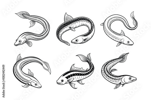 eel fish logo vector design, labeled line art and linocut silhouette illustration.