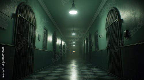 Eerie Abandoned Corridor with Dim Lighting and Shadowy Ambiance in a Decaying Institutional Building Evoking Themes of Isolation and Mystery
