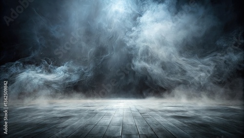 Eerie and mysterious fog envelops a dark wooden floor, creating a sense of anticipation and mystery