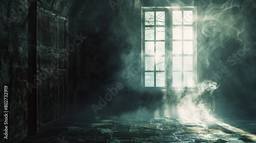 Eerie basement view, light filtering through a door into a dark dungeon-like space, filled with smoke and shrouded in mist and cobwebs