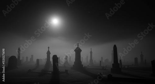 Eerie black and white cemetery silhouette with full moon and foggy atmosphere