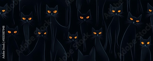 Eerie Black Cat Silhouettes with Glowing Eyes in Repeating Pattern for Halloween Design