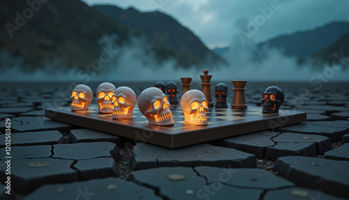 Eerie chessboard in desolate wasteland with glowing skull pieces, mysticism