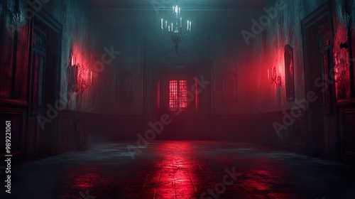 Eerie dark castle with glowing neon banners fluttering in wind picture