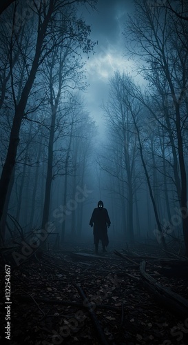 Eerie figure in foggy forest at night with spooky atmosphere and mysterious vibe
