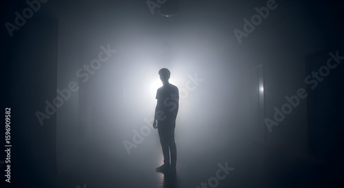 Eerie figure stands mysteriously alone in fog-filled room creating suspense and intrigue for dark thrillers