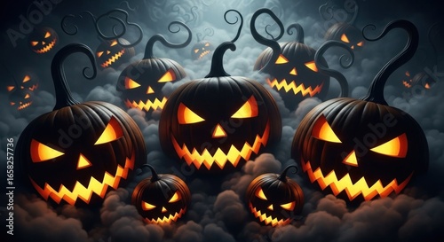 Eerie glowing jack-o'-lanterns with carved faces create a spooky Halloween atmosphere on a dark night.