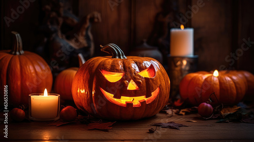 Eerie Halloween Backdrop: Glowing Jack-o'-Lantern Pumpkin Surrounded by Candles, Generative AI