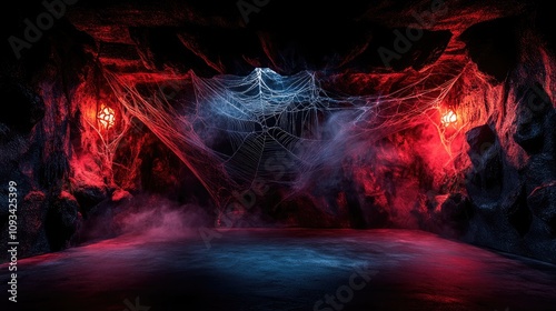 Eerie Halloween decoration showcasing an artificial spider web amidst a dark, atmospheric setting with glowing red lights and misty background.