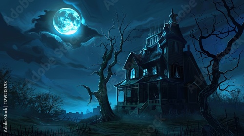 Eerie Haunted House Horror Scene Background with Spooky Atmosphere, Creepy Victorian Mansion, Ghostly Shadows, and Halloween Decoration for Dark Fantasy Design