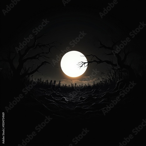 Eerie landscape with full moon, dark silhouettes, and barren trees, moody atmosphere.