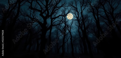 Eerie moonlight bathes ancient trees in a dark, shadowy forest , eerie, full moon