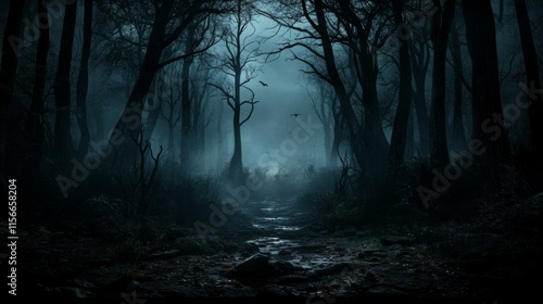 Eerie Night Forest Scene with Tall Bare Trees, sinister