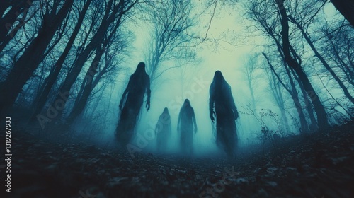 Eerie scene of three ghostly figures wandering through a dark and mystical forest setting