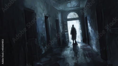 eerie silhouette in a dark hallway leading to an open door on halloween night digital painting