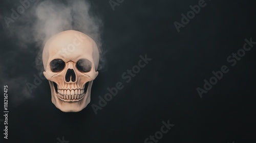 Eerie Skeleton Skull with Mysterious Smoke on Dark Black Background for Halloween and Gothic Themes in Stock Photography