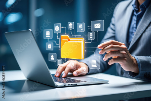Efficient Data Management A Person Using a Laptop with a Digital Folder Icon and Network of Connected Documents Illustrating Streamlined Workflow and Information Organization