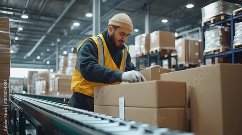 Efficient Warehouse Worker Sorting Packages on Conveyor Belt