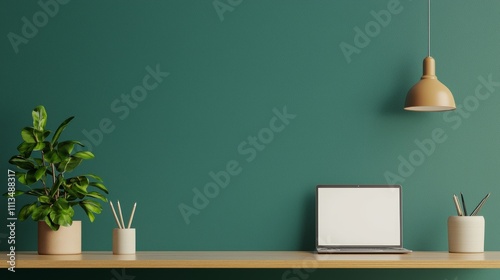 Efficient workspace setup with muted colors and ambient lighting home office interior design minimalist environment eye-level viewpoint