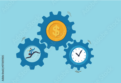 Effort and time to make money, success long term investment, deadline effect to make people finish work concept, businessman running with full effort inside gear cogs to spin time and money gears.