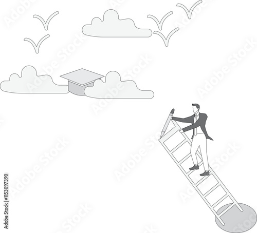 Efforts to achieve higher education, cost to graduate high degree education, man uses a pencil to make a ladder leading to the graduation cap so he can achieve high education vector illustration