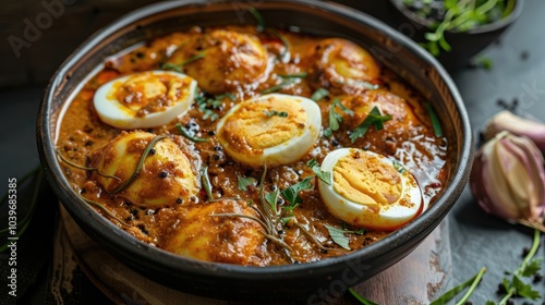 Egg curry or Anda curry or egg masala popular spicy food Indian non veg side dish for rice roti Appam Chapati Porotta Parantha