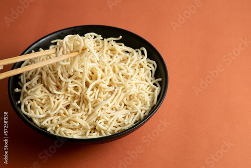 egg noodle on a black bowl. hold with wooden chopstick. brown background