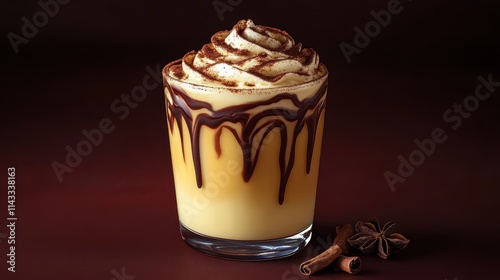 Eggnog topped with a cinnamon swirl and chocolate drizzle, isolated on a dark burgundy background