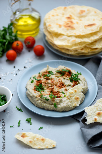 Eggplant dip baba ganoush (mutabbal) with herbs and paprika on gray wooden background. Selective focus. Traditional arabian food