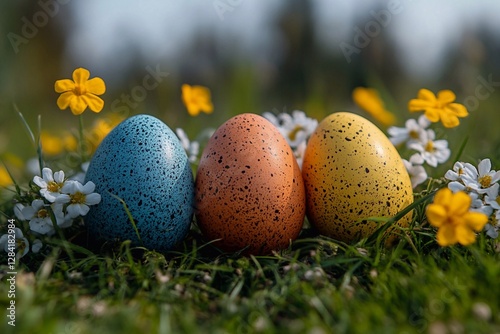 Eggs dyed with organic dyes, against the background of an environmentally friendly natural environment.