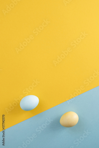 Eggs on a yellow and light blue background. Easter decor. Yellow and blue color