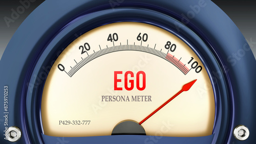 Ego and Persona Meter that is hitting a full scale, showing a very high level of ego, overload of it, too much of it. Maximum value, off the charts. ,3d illustration